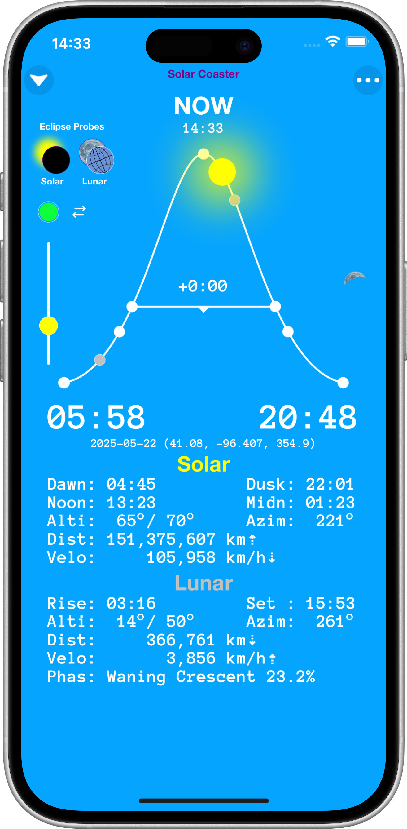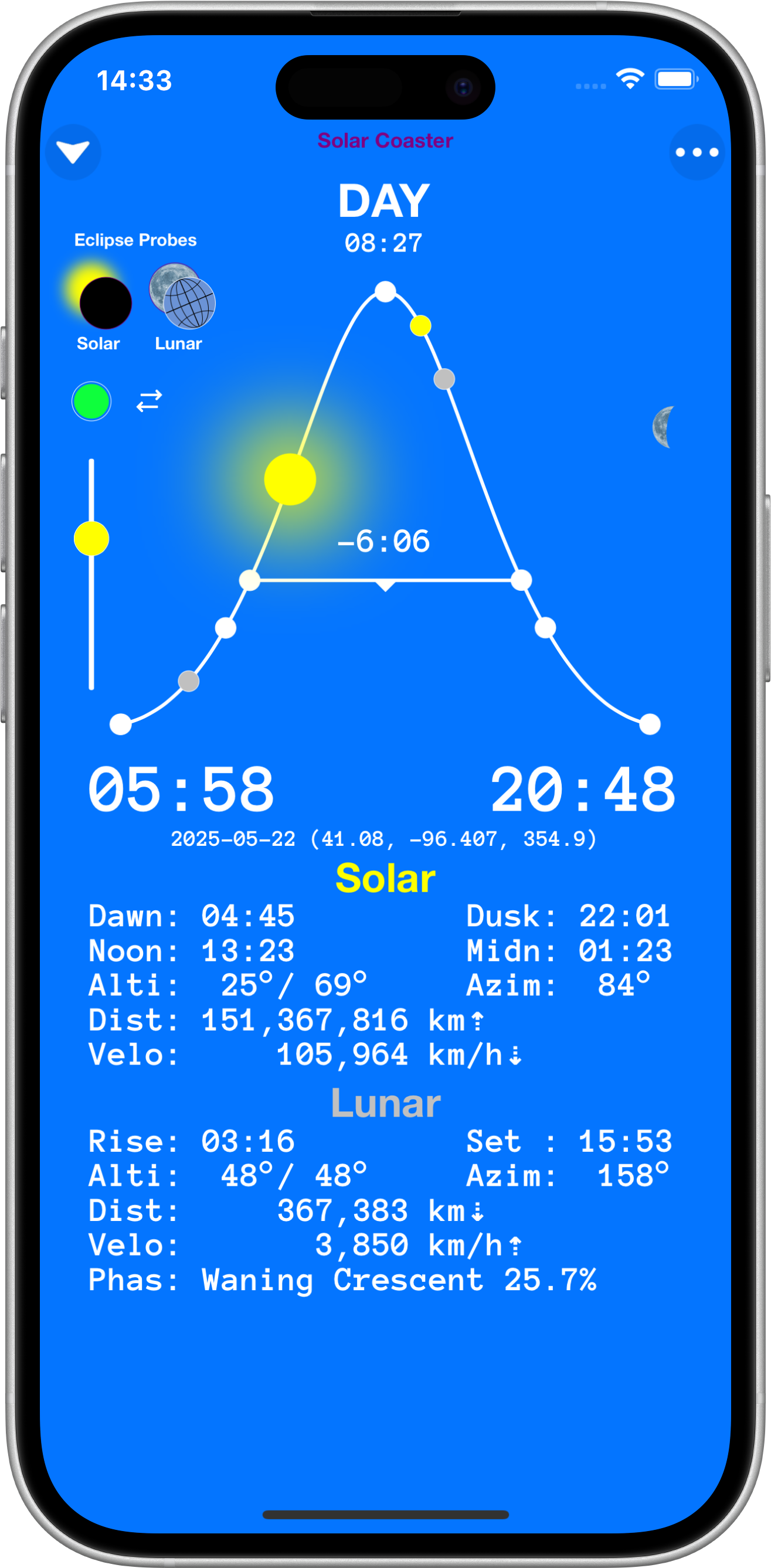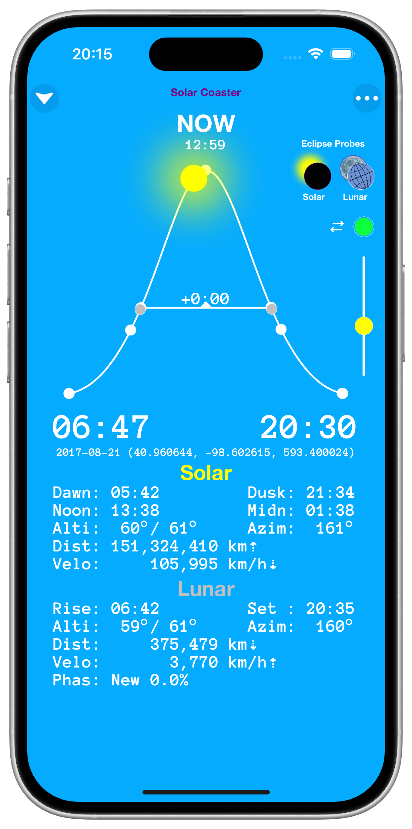 Solar Coaster provides accurate position, time, motion and eclipse information for Earth's
