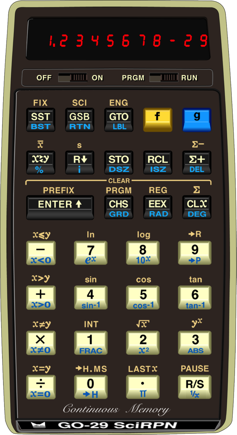 GO-29 SciRPN closely simulates the venerable HP-29C Programmable Pocket Scientific Calculator. The HP-29C was released in 1977 and sold for a MSRP of $195. Virtually indistinguishable from the real item in operation, GO-29 is a powerful yet simple retro calculator.