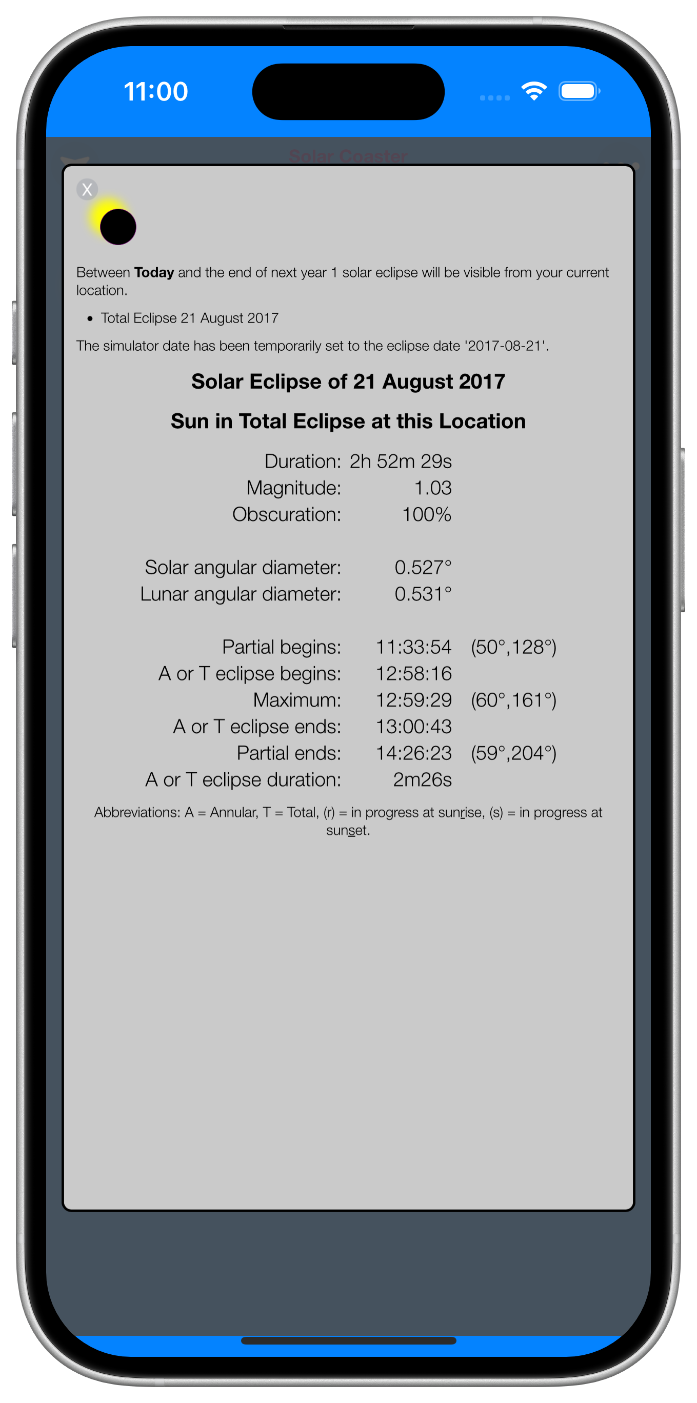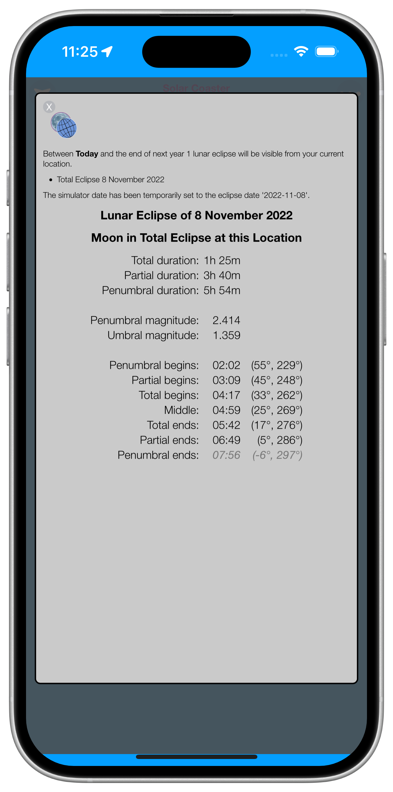 the eclipse circumstances are displayed and the simulator is temporarily reset to the eclipse date, allowing you to view metrics and