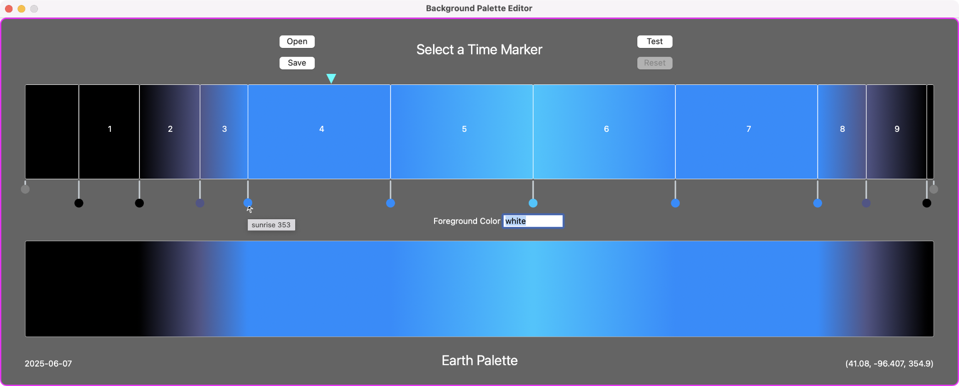 for macOS. The editor uses a palette of colors you choose and associate with cardinal times of the day (Sunrise, etc.),