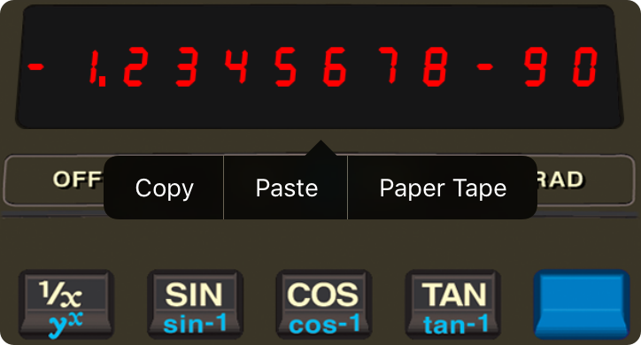 The display shows the X stack register, usually the result of the latest calculation. Tapping the display brings up the Copy / Paste / Paper Tape menu, allowing you to export the value of X, import a new value of X, or annotate the paper pape (Copy / Paste unavailable on Apple TV).