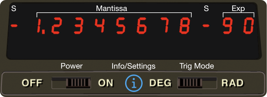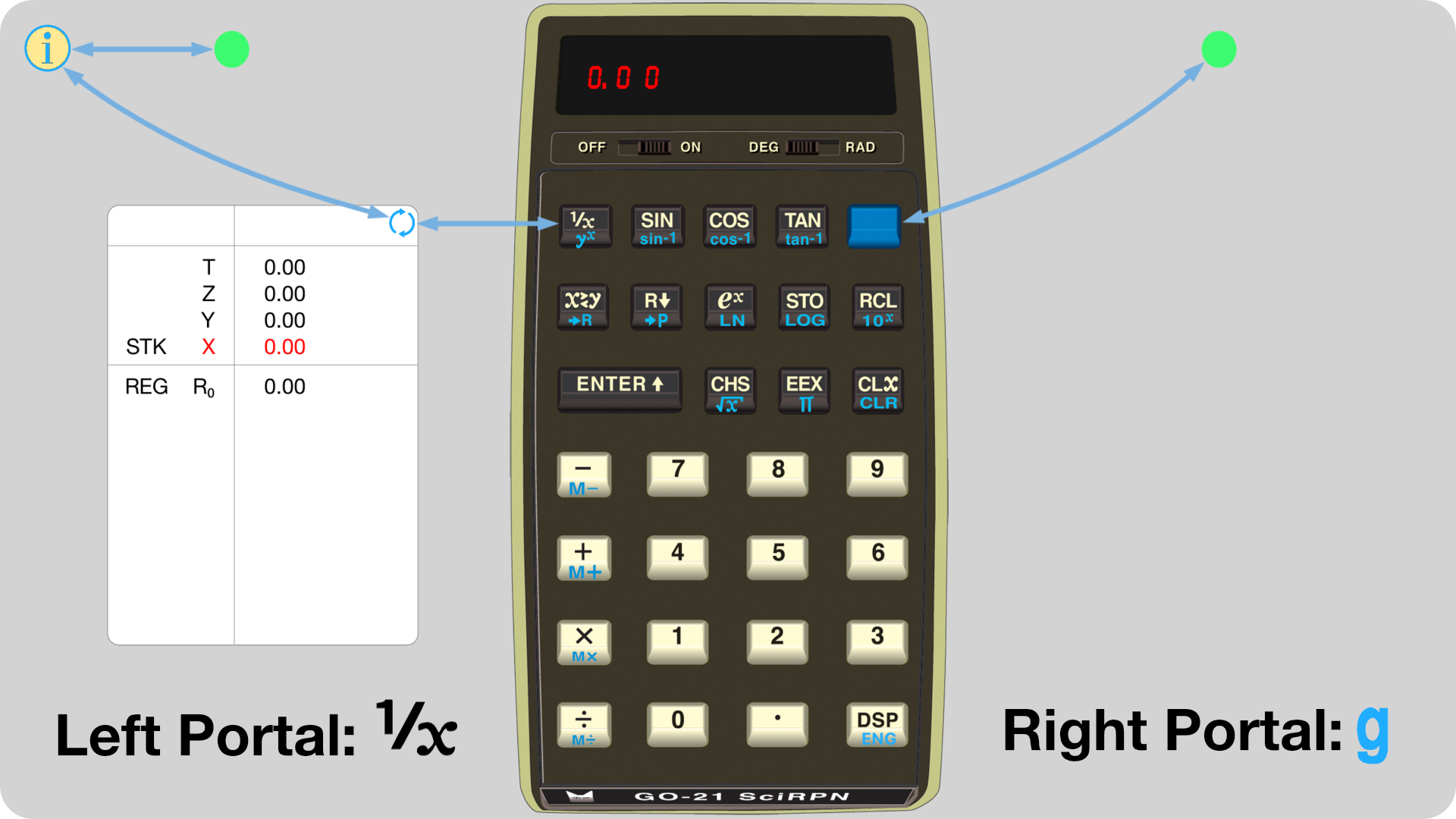 GO-21 provides views of the calculator's internal state unavailable on the real hardware. This makes using the calculator much easier. Access to this additional information is controlled by a double-tap on the calculator display. If the information view is visible, a double-tap hides the view. If the view is not visible, the information view appears. So a double-tap toggles the visibility of the auxiliary information. If you eschew gestures and prefer buttons, enable the Accessibility setting Auxiliary View Assist.