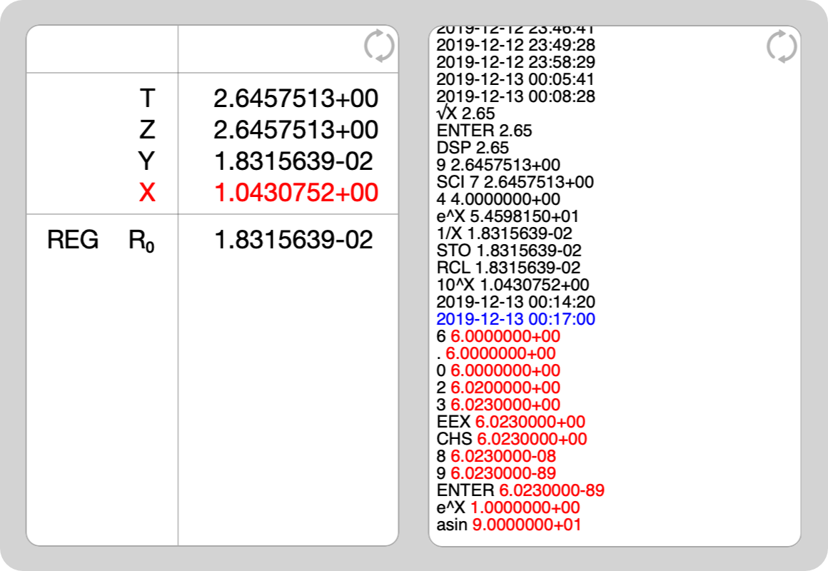 The auxiliary view shows the 4 stack registers and the memory register. Touching the switch-views control transitions to the paper tape window and shows up to 200 lines of key-press history to help you make sense of the values you see in the stack-register window.