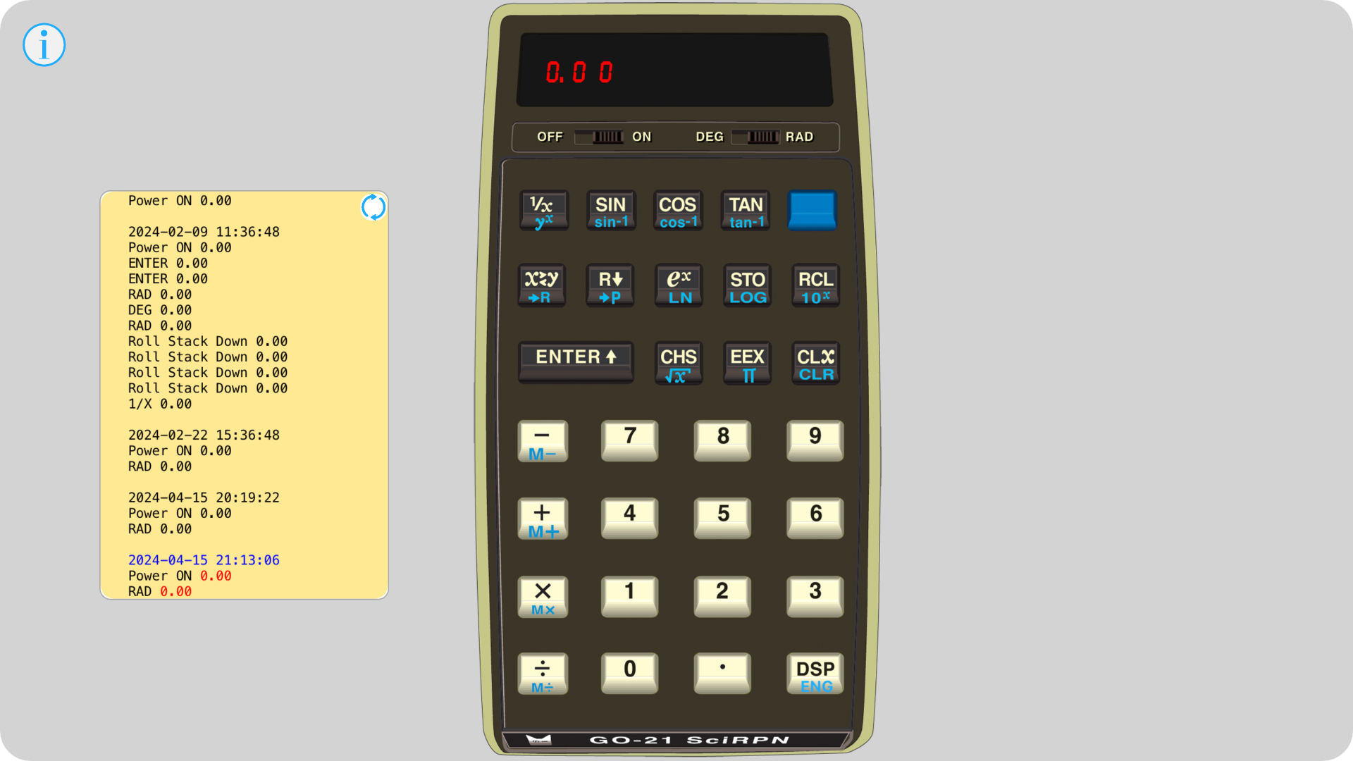GO-21 SciRPN closely simulates the venerable HP-21 Pocket Scientific Calculator. The HP-21 was released in 1975 and sold for a MSRP of $125. Virtually indistinguishable from the real item in operation, GO-21 is a powerful yet simple retro calculator.