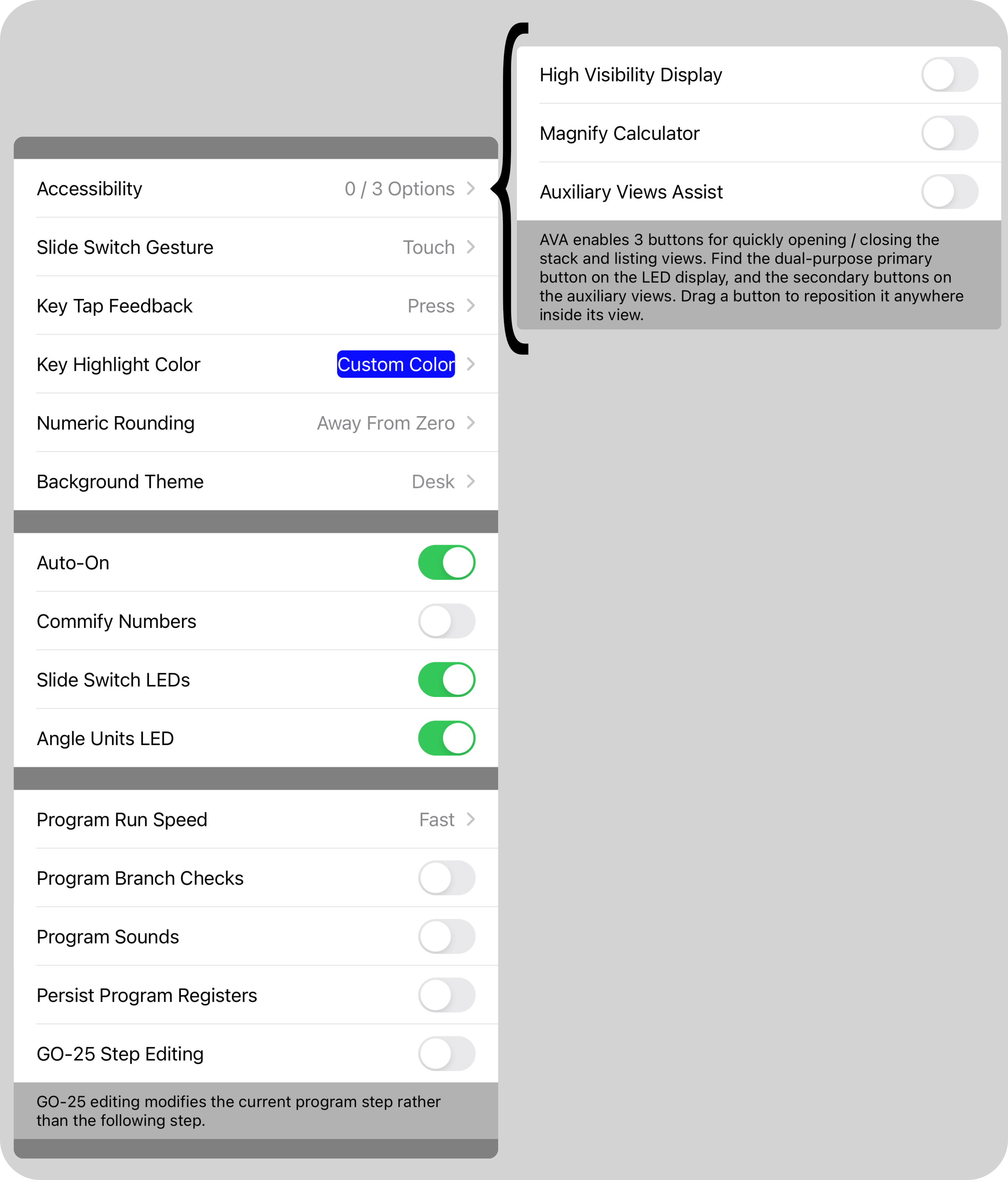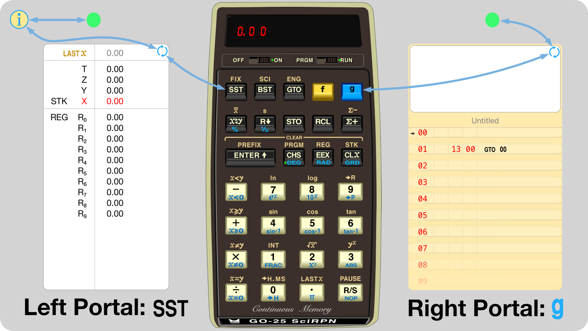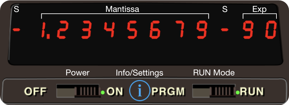 The GO-25 LED window acts as a display area, as well as a touch sensitive input area that initiates further activities not available on an actual HP-25C. The calculator display is also modal, so what it displays and how it reacts to touches depends on the setting of the PRGM-RUN switch.