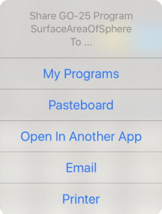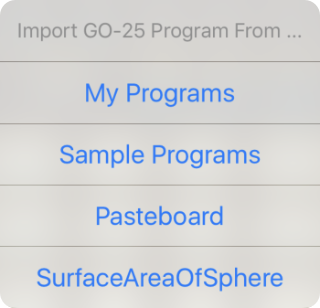 brings up the Import PRGM / Share PRGM menu, allowing you to transfer GO-25 programs