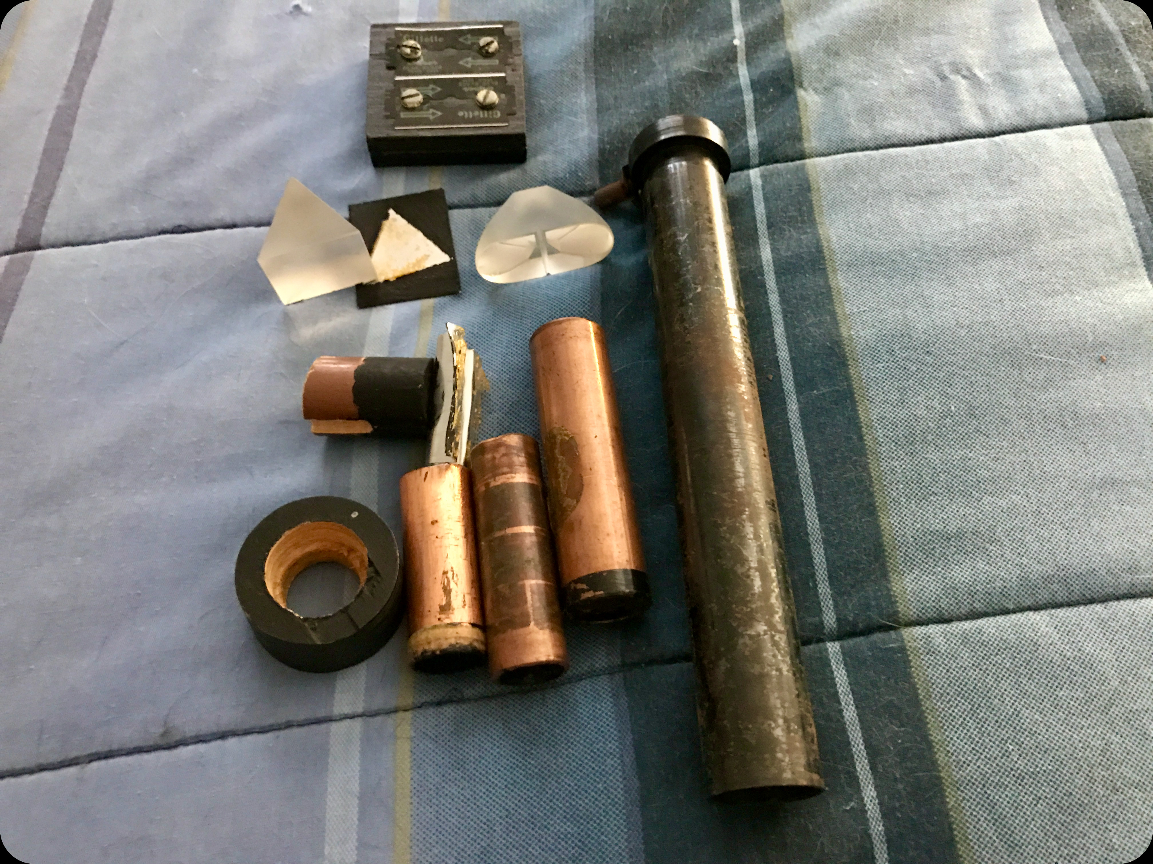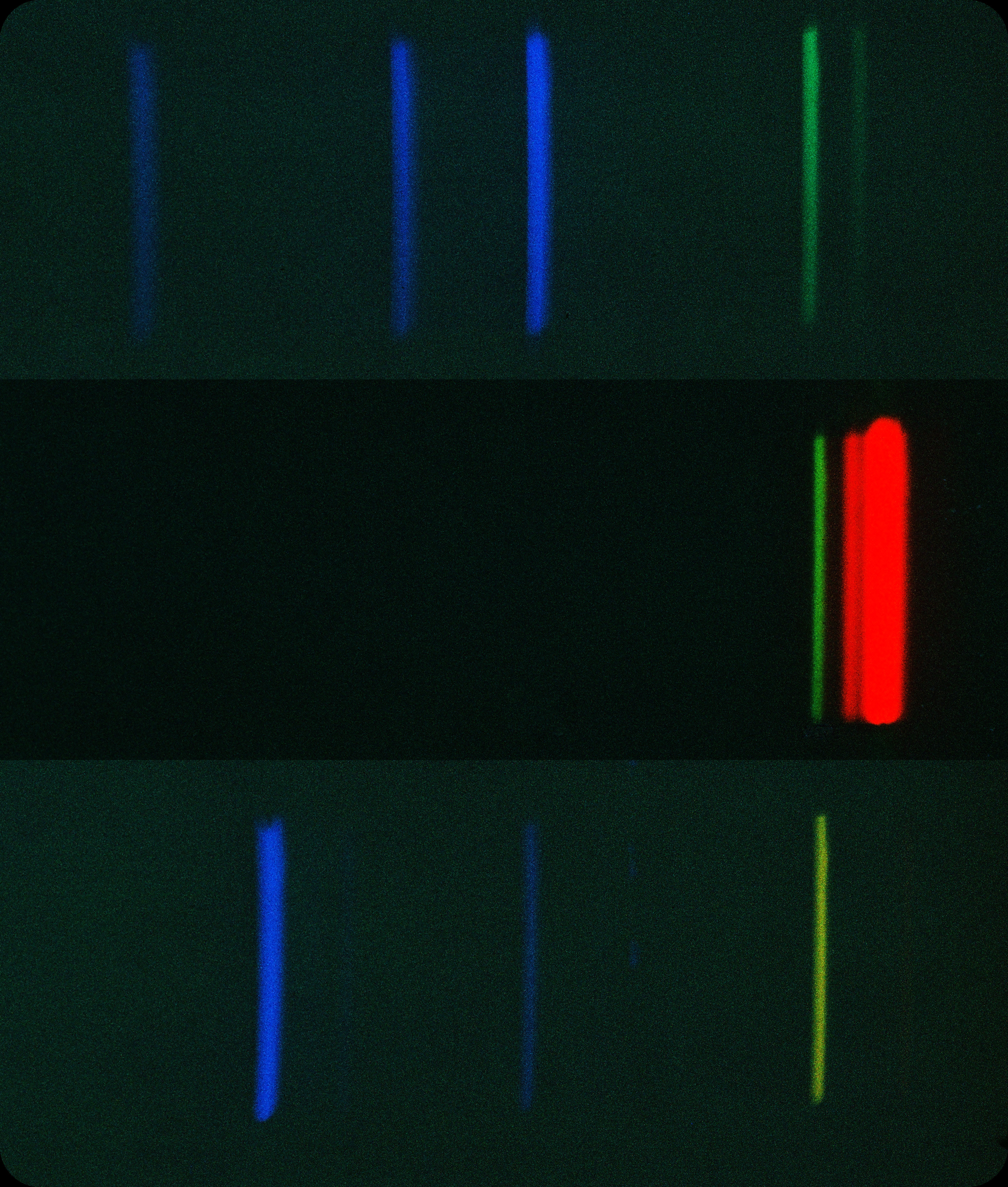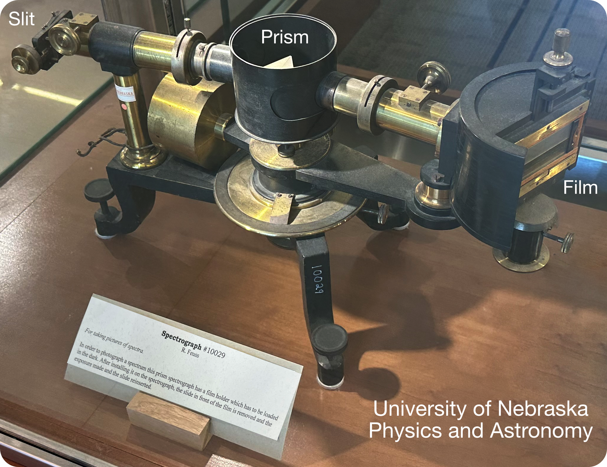 The kid built a spectrograph from wood, pipe, electrical tape, razor blades, a lens and a prism. The kid was completely untrained, but with his new instrument and a Kodak Instamatic-like camera he obtained pictures of the resulting light spectra, some of which are presented here. There is room for improvement 🙂 ! The spectrograph in the UNL cabinet could be 100 years older and perform better. One transparancy was labelled "Hg Vapor" but I'm not convinced. Did I mention the kid was unschooled in these subjects?